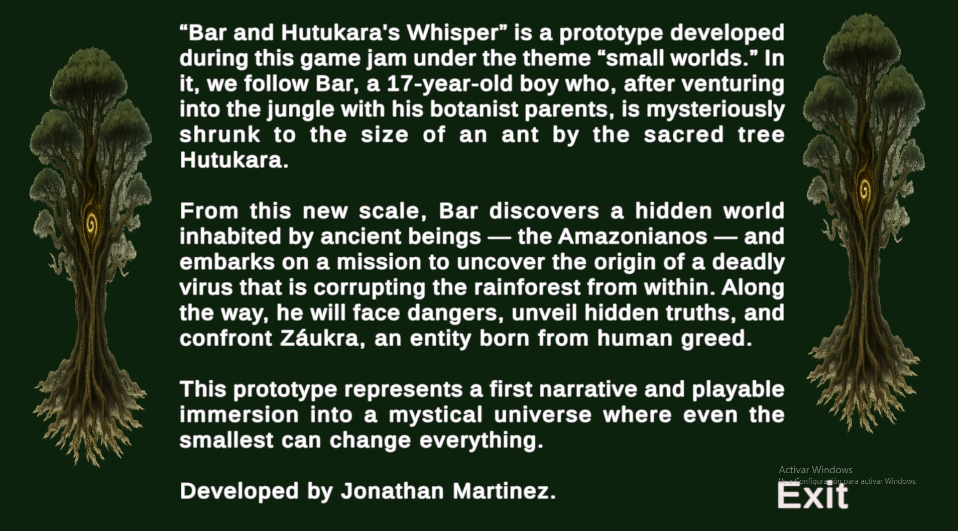 “Bar and Hutukara's Whisper” is a prototype developed during this game jam under the theme “small worlds.” In it, we follow Bar, a 17-year-old boy who, after venturing into the jungle with his botanist parents, is mysteriously shrunk to the size of an ant by the sacred tree Hutukara.